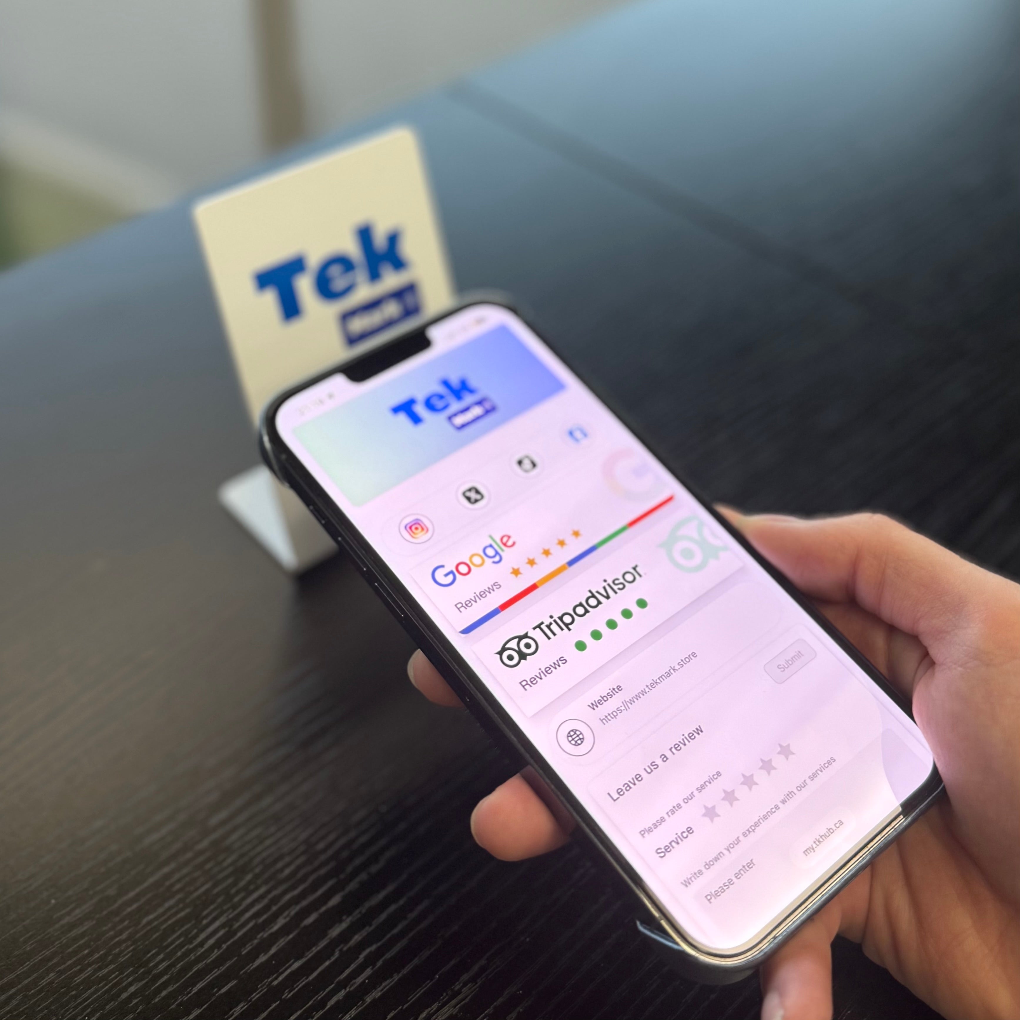 A TekMark device instantly pulls up the details from your TekMark profile on someone’s phone with a simple tap. Your TekMark profile is fully customizable—bio, social links, payment info, files, and more—so you can share every key detail about you and your business. Best of all, you only need your TekMark device to start connecting: no apps, no tricks, no subscriptions.